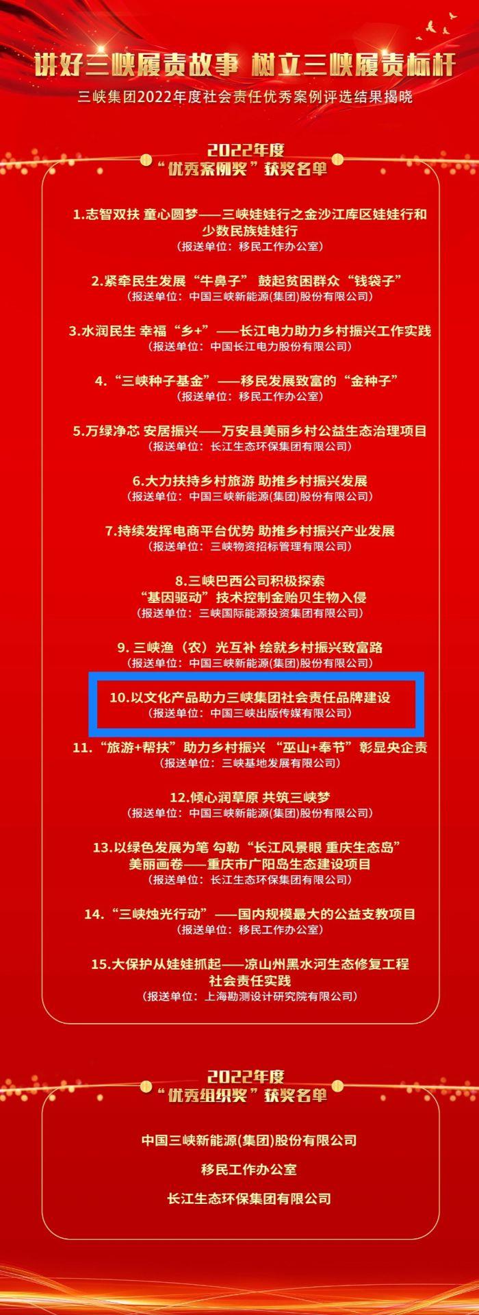 近日,集团公司首届社会责任优秀案例评选结果揭晓,传媒公司《以文化产品助力三峡集团社会责任品牌建设》案例荣获“优秀案例奖”。