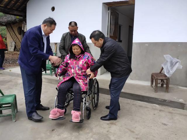 ▲ 高桥村村民开心地坐上爱心轮椅 摄影:覃东海