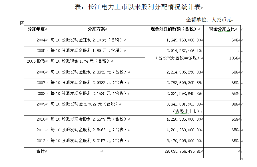 作为国内最大的水电上市公司,长江电力自2003年在上海证券交易所上市以来,一直秉承“诚信经营、规范治理、信息透明、业绩优良”的经营理念,以“为社会奉献清洁能源、为股东提供满意回报”为经营宗旨,在三峡集团的大力支持下,于2009年实现了三峡发电资产整体注入长江电力,长江电力得以实现规模与效益的同步快速扩张,将奔流不息的长江水转化为源源不断的强大电能,进而形成公司稳定充沛的现金流,创造了优良业绩,为股东提供了良好回报。2012年,长江电力充分利用长江来水较好,地下电站全面投产的有利条件,精心组织三峡-葛洲坝梯级电站的运行维护,科学调度,发电量、实现利润创历史新高,公司董事会、股东会审核批准的现金分红总额54.70亿元,股息率达到4.37%。