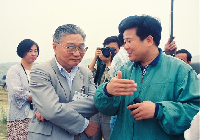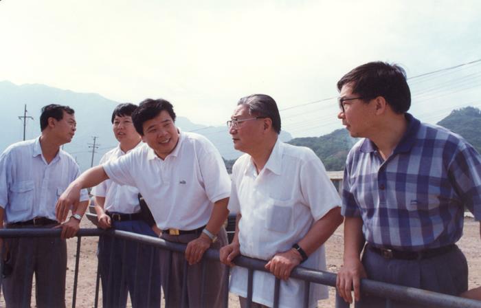 | 1997年9月,陈飞与潘家铮院士在三峡工地。(李向阳 摄) |