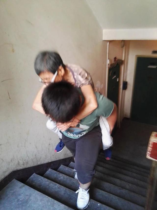 何红霞的儿子背婆婆上楼