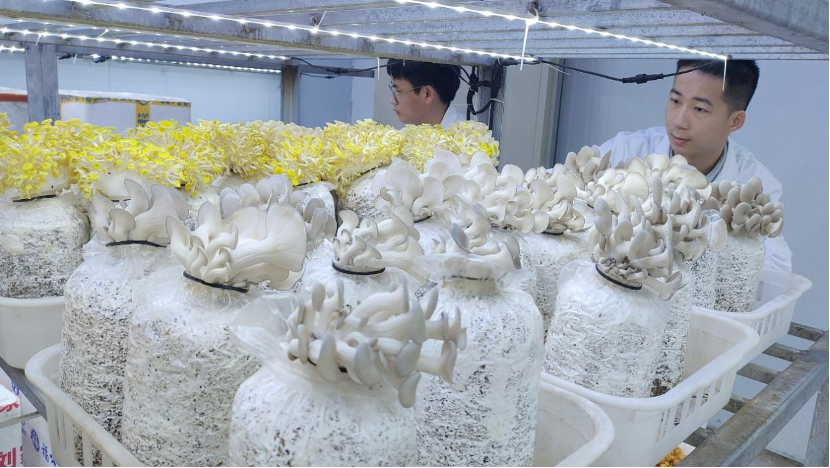 ▲ 技术人员在大棚培育菌菇新品种 石富村村委会供图